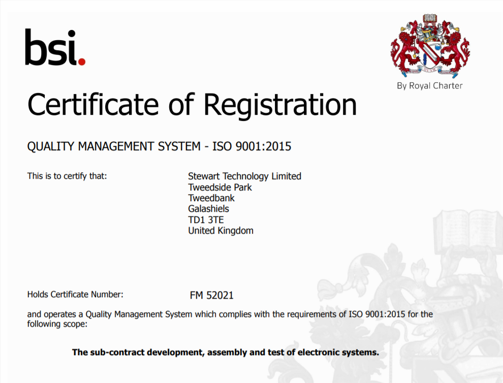 At Stewart Technology, we are committed to delivering excellence through rigorous and consistently applied quality standards. We have proudly maintained ISO 9001 accreditation since 1999, demonstrating our long-standing dedication to robust processes, continuous improvement and customer satisfaction.